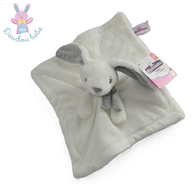 Doudou plat Lapin polaire blanc gris écharpe POMMETTE