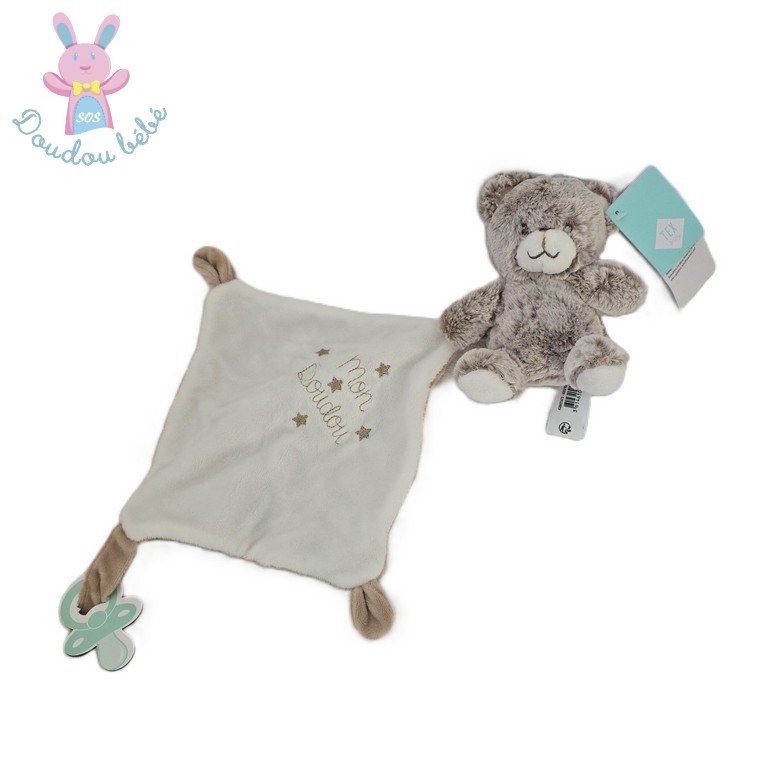 Doudou Ours beige blanc mouchoir « mon doudou » attache tétine TEX